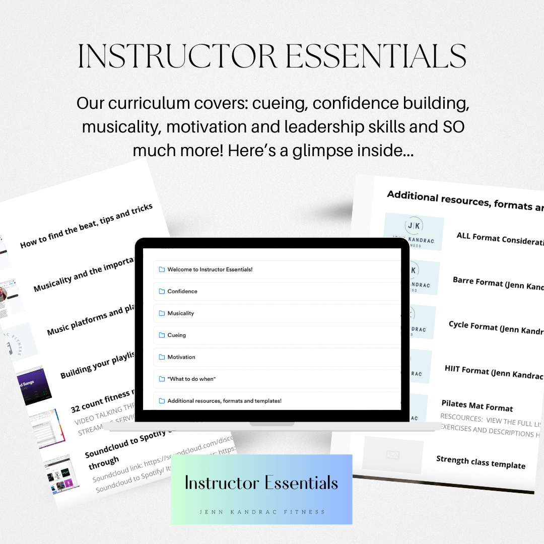 "As a group fitness instructor, I had been teaching classes such as bootcamps, HIIT, and Circuit training. These are all timed or rep based classes. I definitely did not feel comfortable teaching anything “on the beat”. When I saw that Jenn was launching an Instructor Essentials course, I thought I would give it a try. It was well worth it!"
