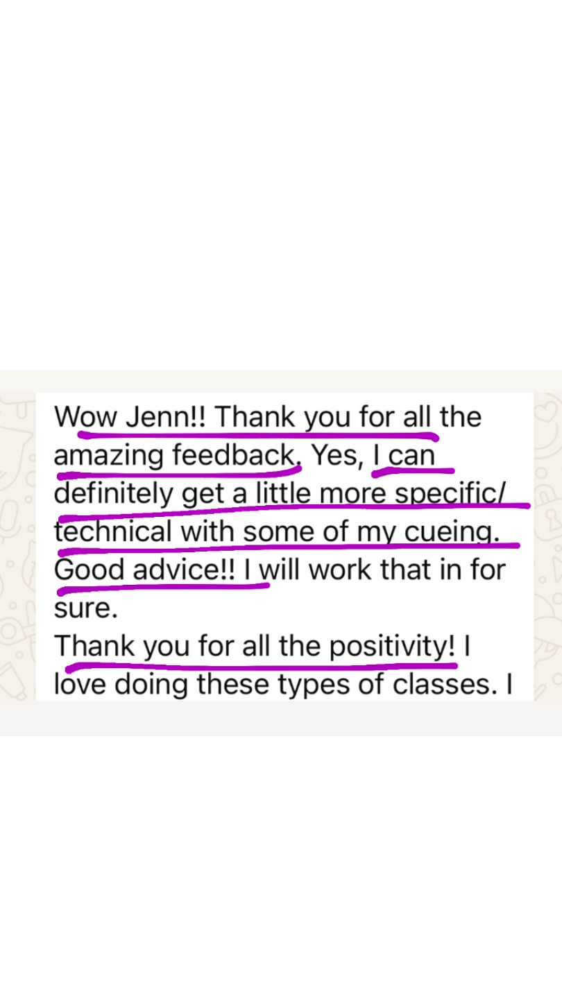 "Jenn helped me learn what it takes to write an effective and strong workout, showed me different exercises I could incorporate that I hadn’t thought of, and taught me the importance of modifications and proper cues. Working with Jenn became a huge support system I didn’t know I needed in my first few months of instructing."